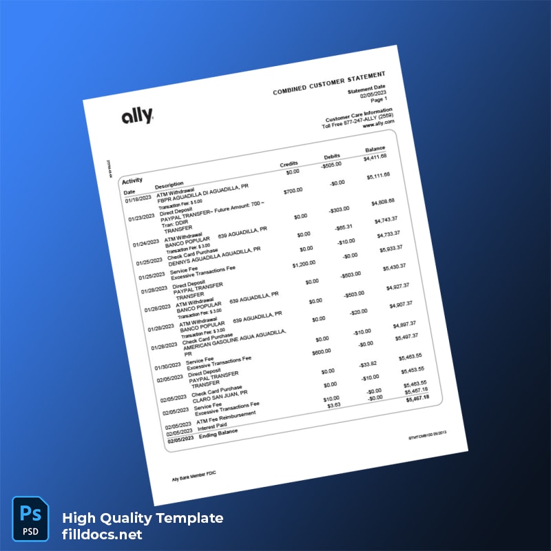 Don’t let the lack of proper documentation stand in your way. Download the USA Ally Bank Statement Template today and regain control over your financial presentation. For additional options, explore our full range of bank statement templates or check similar items like the editable bank statement template in Excel format.