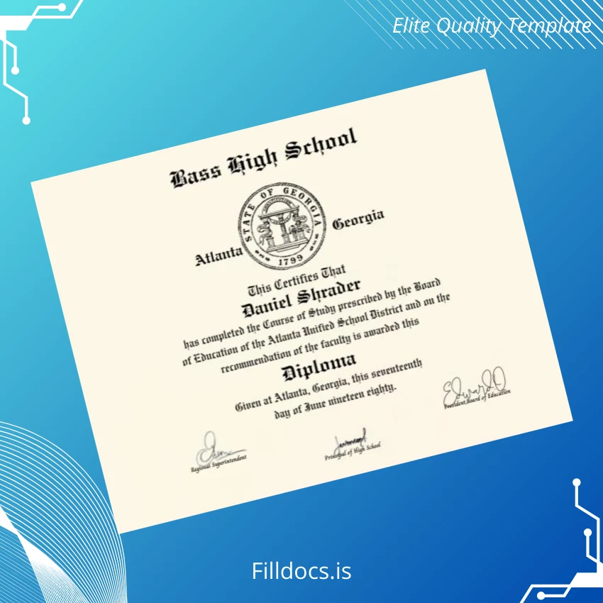 This template is an editable and customizable diploma form crafted specifically for USA Bass High School. It provides users with a blank canvas to input personalized names, dates, and other essential information. Delivered in Word and PDF formats, it caters to users looking for an easily modifiable and professional diploma design.