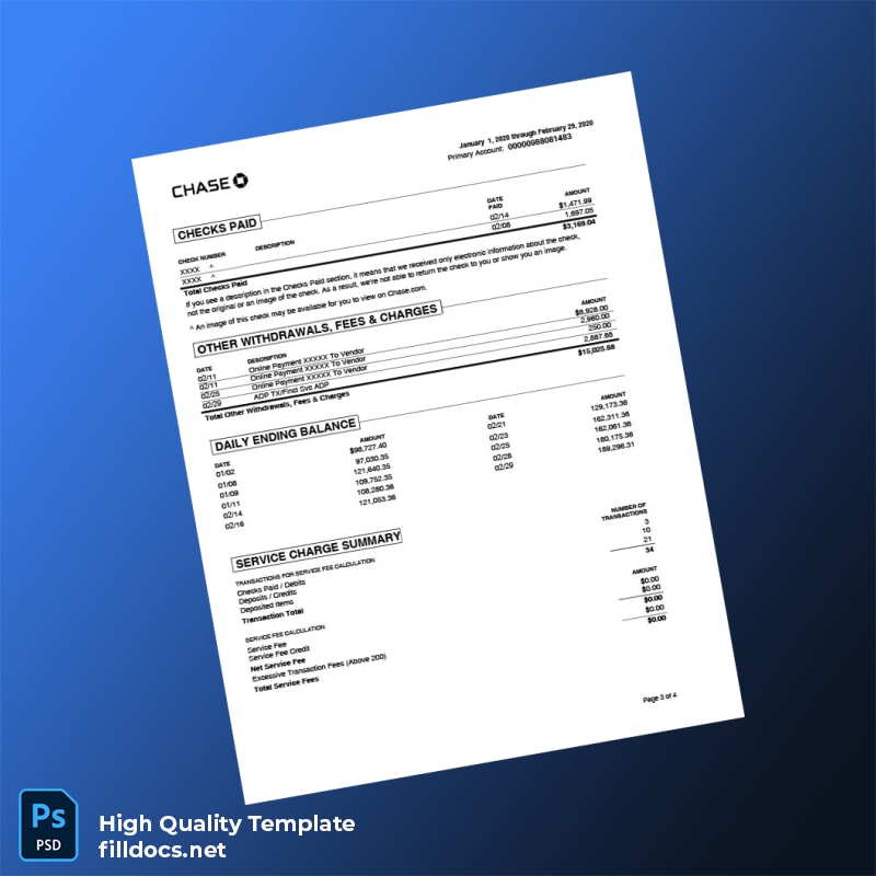 Don’t let document troubles slow you down. Invest in our USA Chase Bank Statement Template today and experience the ease of managing your banking needs effectively. Explore more templates, like our editable bank statement template for quick adaptations or our 3 months bank statement PDF for lean documentation.
