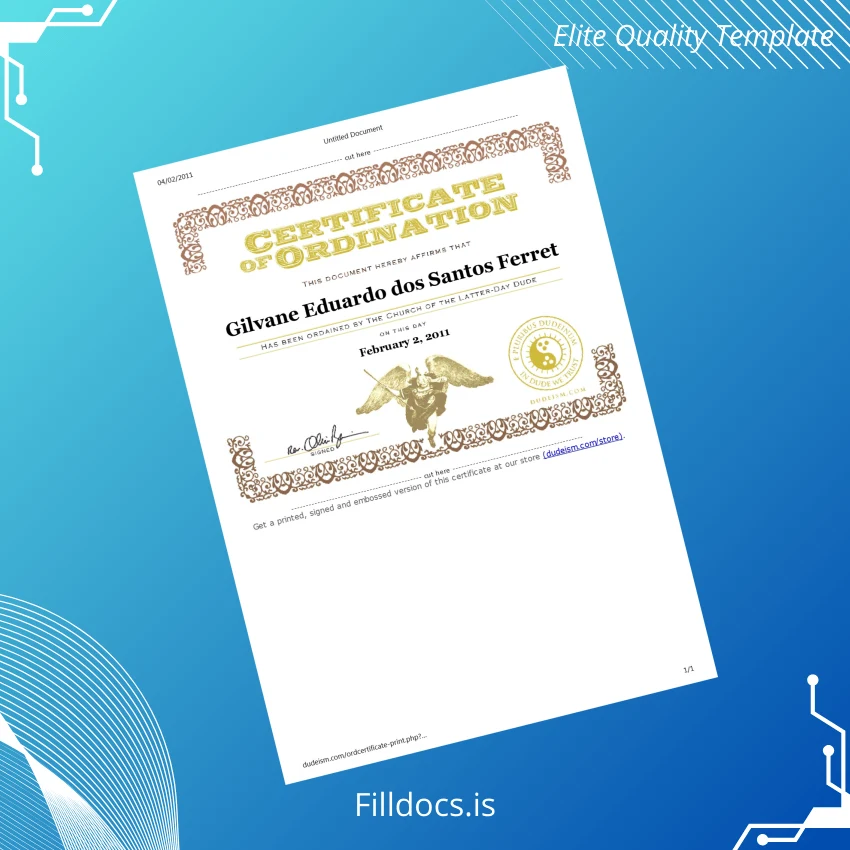 The USA Dudeism Certificate of Ordination Template – Word/PDF is a fillable, customizable document crafted for those seeking a professional, novelty diploma-style certificate with ease and flexibility. This digital diploma download offers a perfect solution for individuals needing a unique certificate format that balances traditional appeal with modern editing convenience.