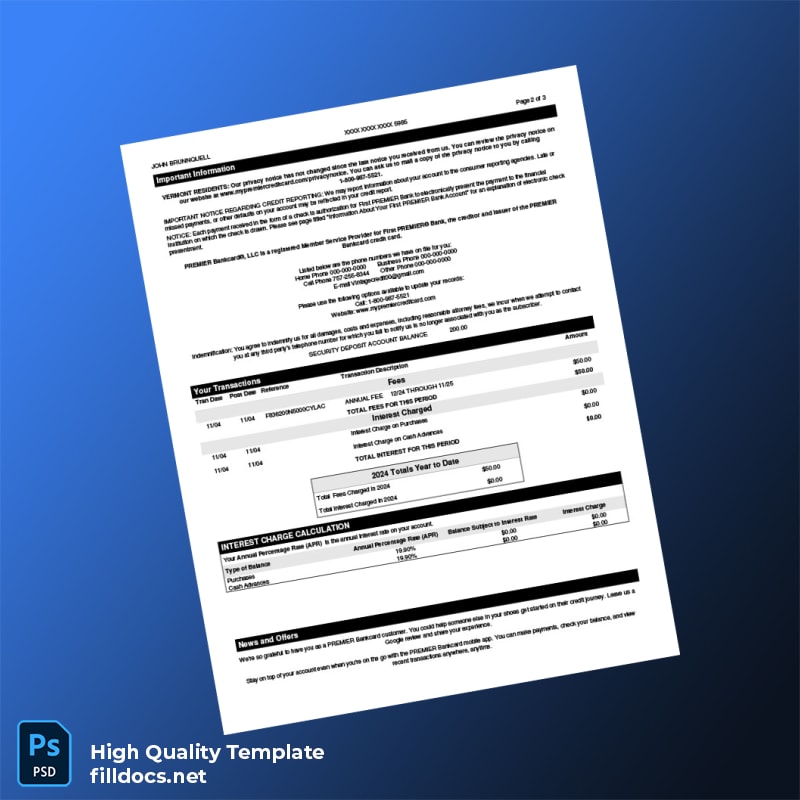 USA First PREMIER Bank Credit Card Statement Template in Word and PDF formats 3 page