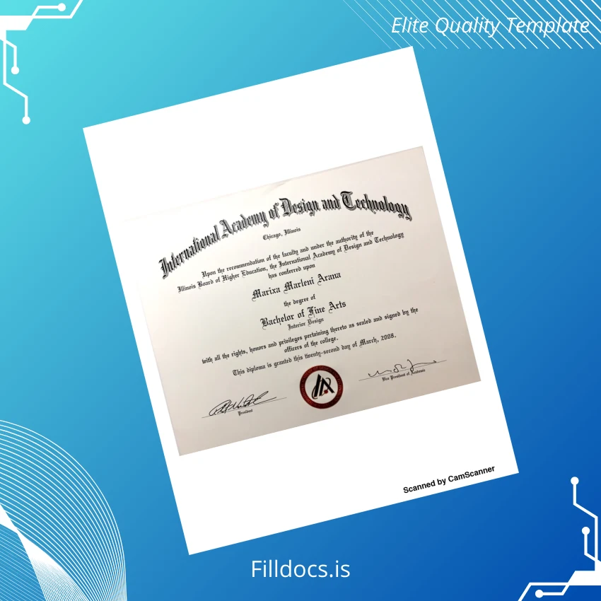 This is a professionally crafted, blank diploma form tailored specifically for the Bachelor of Fine Arts in Interior Design from the USA International Academy of Design and Technology. It provides a novel and authentic-looking certificate format, available in fully customizable Word and PDF versions, perfect for users seeking a reliable replacement diploma template or a novelty diploma design that looks official and polished.