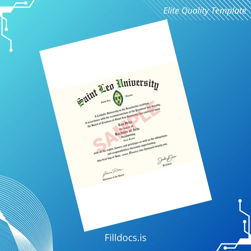This USA Saint Leo University Bachelor of Arts Accounting Template in Word and PDF format offers a professional and customizable solution for those requiring a digital diploma replica. Ideal for replacing lost or damaged diplomas, this template combines visual accuracy with high-quality design fidelity.