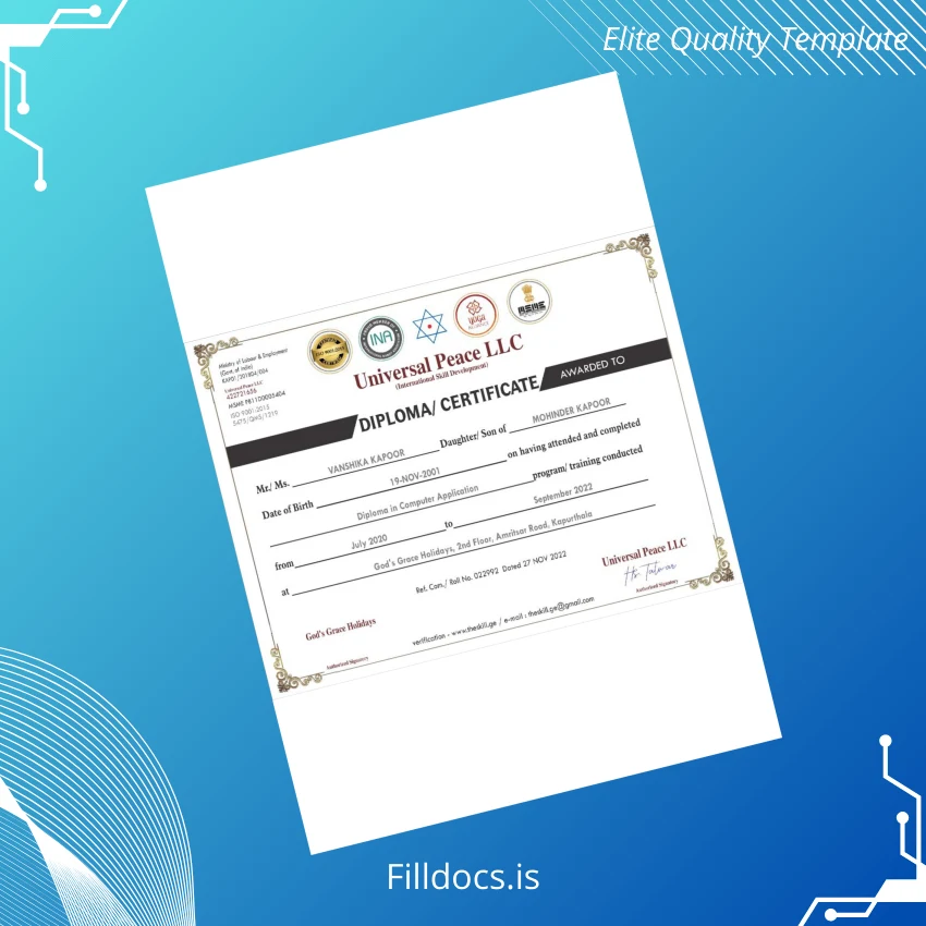 Discover the USA Universal Peace LLC Diploma in Computer Applications Template – Word/PDF, a meticulously crafted, fillable template designed for professionals seeking a customizable and high-quality diploma solution. This digital diploma download is perfect for educators, institutions, and individuals who require a versatile, editable diploma template that delivers both aesthetic appeal and functional precision.