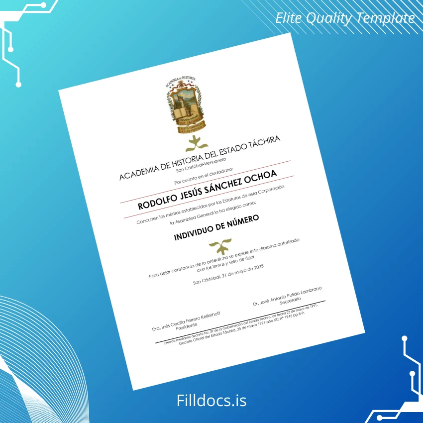 The Venezuela Academy of History of the State Táchira Diploma Certificate Template – Word/PDF is a professional and fully customizable digital diploma form designed to meet the highest standards of academic recognition. This fillable template allows educators, institutions, and administrative professionals to quickly and efficiently generate official-looking diplomas with ease. Ideal for those seeking a reliable and editable replacement diploma template, this product covers all your documentation needs with precision.