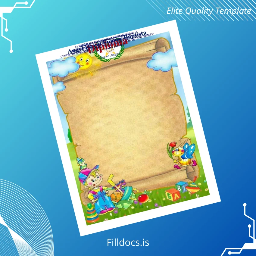 This editable diploma template is a digital download that provides a blank diploma form specifically formatted for the Venezuela Centro de Educación Inicial _Ramón David Palomares_, enabling schools and administrators to create official promotion diplomas to first grade efficiently. Its clean layout and authentic style make it perfect for formal recognition of student achievements.