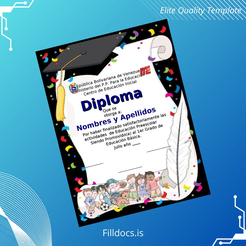 This template is a customizable diploma certificate specifically styled for preschool education credentials issued by Venezuela’s Ministry of Popular Power for Education. It serves as a convenient blank diploma form that can be filled electronically with all official information, providing a seamless solution for institutions requiring standardized yet editable diploma formats. Whether you need a replacement diploma template or a digital diploma download, this product offers an accessible way to produce authentic-looking diplomas.