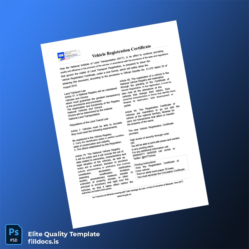 Complete Venezuela National Institute of Land Transportation Vehicle Registration Certificate Template – Word/PDF